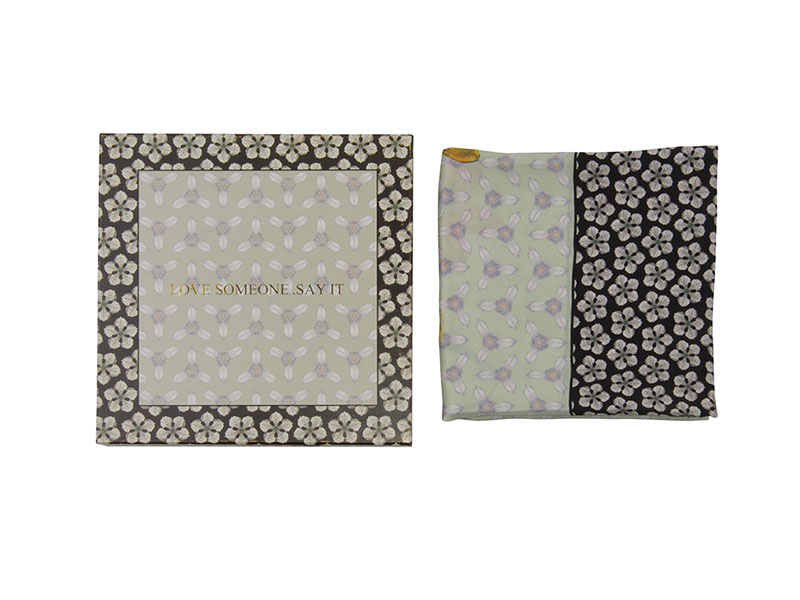 Features: Gift box included. The scarf’s print is on the lid